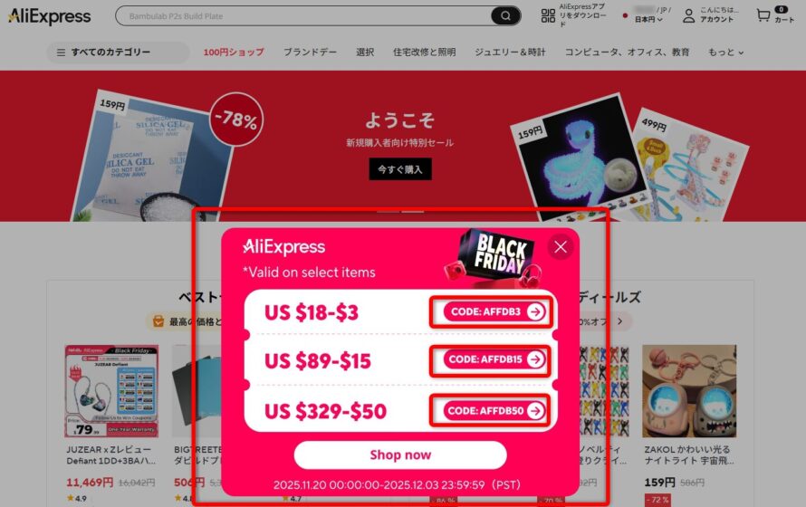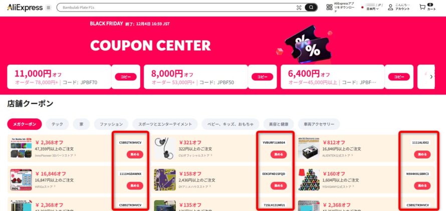 - 全体コード(AliExpressコード(JP~))プロモーションコード(AFF~、IFP~)とストアコード(店舗クーポン)は重ねがけ可能、必ずチェックする
