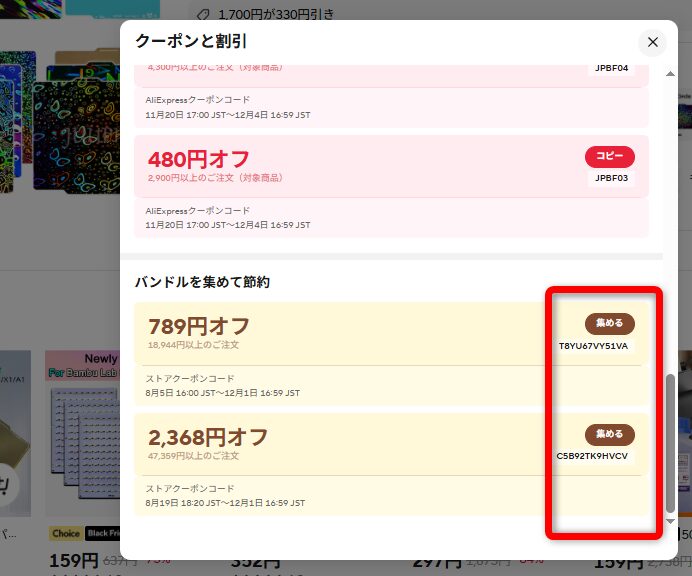 こちらのコードはAliExpressコードやプロモーションコードと違い購入画面でコピペするだけではなく、「集める」ボタンを押してクーポンを入手しておかないと使用することができません。