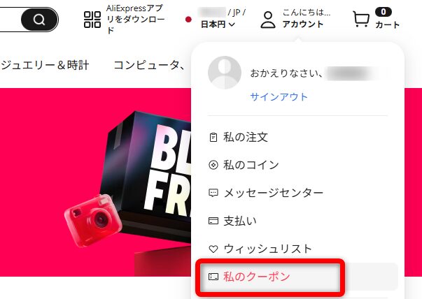 入手したクーポンはアカウント>私のクーポンで確認することができます。